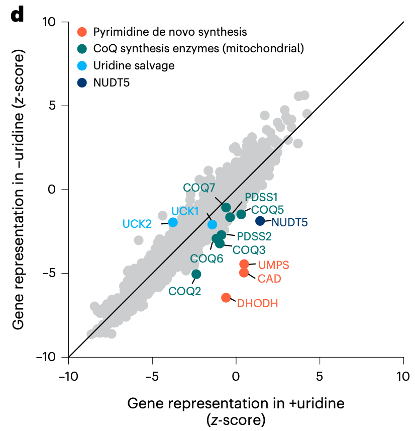 Uridine-sensitized screening identifies demethoxy-coenzyme Q and NUDT5 as regulators of nucleotide synthesis.